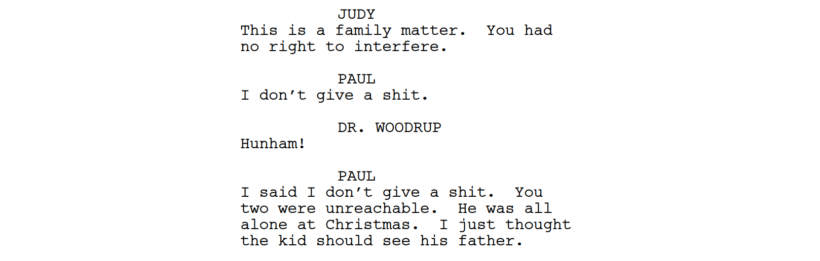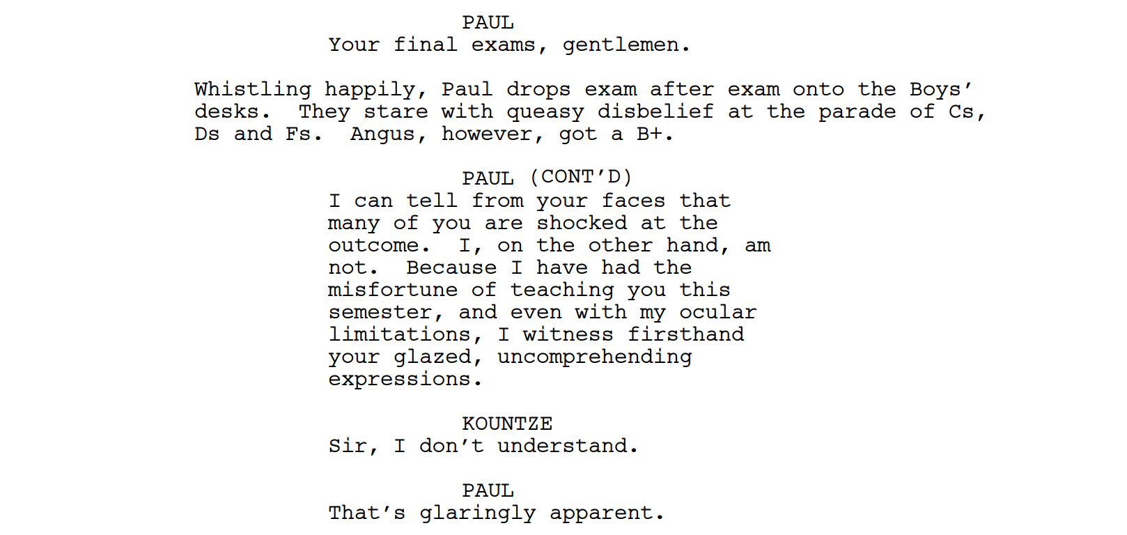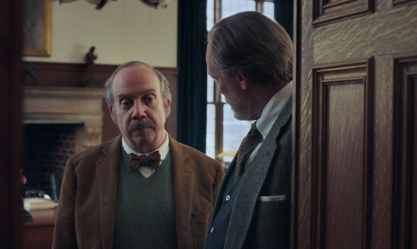 Paul meets Headmaster Woodrup, who informs him he must stay at Barton over the holidays to supervise the remaining students – a punishment for the costly political indiscretion of flunking a major donor’s son. Woodrup rubs salt in the wound, suggesting Paul “didn’t have plans anyway.”