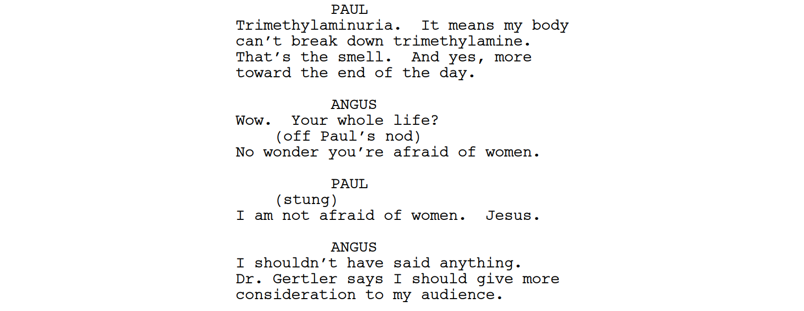 As if he’s reluctant of their growing camaraderie, Angus tells Paul that he smells, which he’s informed is a side effect of Trimethylaminuria, one of various conditions he suffers from. Angus feels bad, invites Paul to return an insult. Paul doesn’t, though he has plenty of comments in his mind. This establishes an ongoing pattern of teasing and challenge.