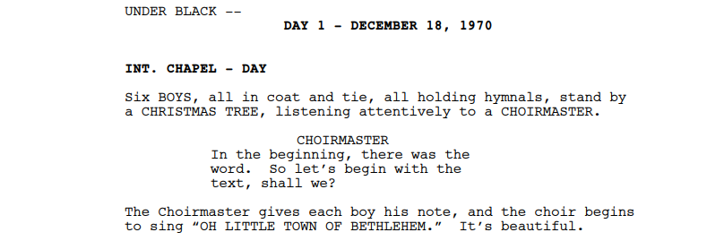 Christmas, 1970. We are introduced to Barton Academy through a brief series of vignettes of a tired New England town, accompanied by the school choir’s voices. Right away, the film sketches a rigid, old-world institution bound by its own traditions. The austere architecture and snowy landscapes imply a place defined by cold order, its severity softened only by a veneer of propriety.