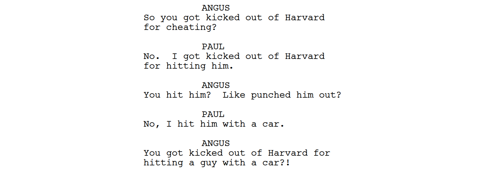 They go out to a local diner, where Paul spots Miss Crane picking up some shifts. Angus deduces Paul’s obvious feelings for her, which are denied. Medicated from his accident, Angus grows scathing of Dr. Woodrup – a former pupil of Paul’s – adding some contention to their professional history. Angus insults some locals, nearly sparking a fight, but Paul defuses it by buying them beers, much to Angus’ annoyance.
