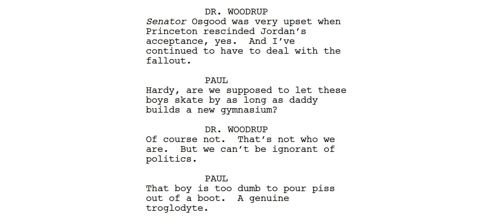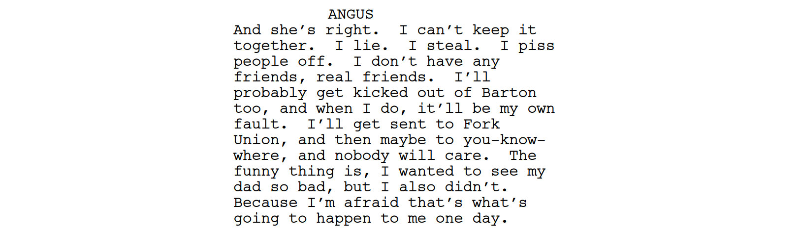 In the dorms, Angus Tully packs for his tropical St. Kitts vacation, flaunting his privilege in front of the kids stuck on campus for the holidays – the “holdovers.” His persona is curated: smart and introspective, but with just enough rebellious edge to stay socially credible.