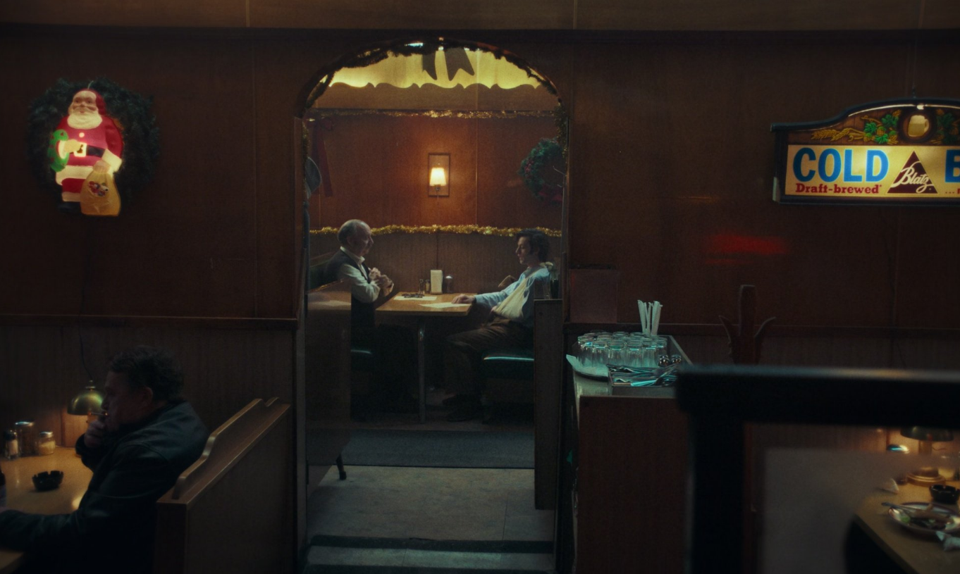 Classics teacher Paul Hunham grades papers while muttering about his “lazy, vulgar, rancid little Philistines” of students. The book-stuffed office, the whiskey, and the worn corduroy leave us wondering whether he’s a genuine tortured scholar… or if he’s desperate to conform to it. As he grinds away, boys race through the halls getting ready for Christmas break – a sharp foil to his stuffy routine. It’s the film’s thesis image: a man soured by his own bitterness.