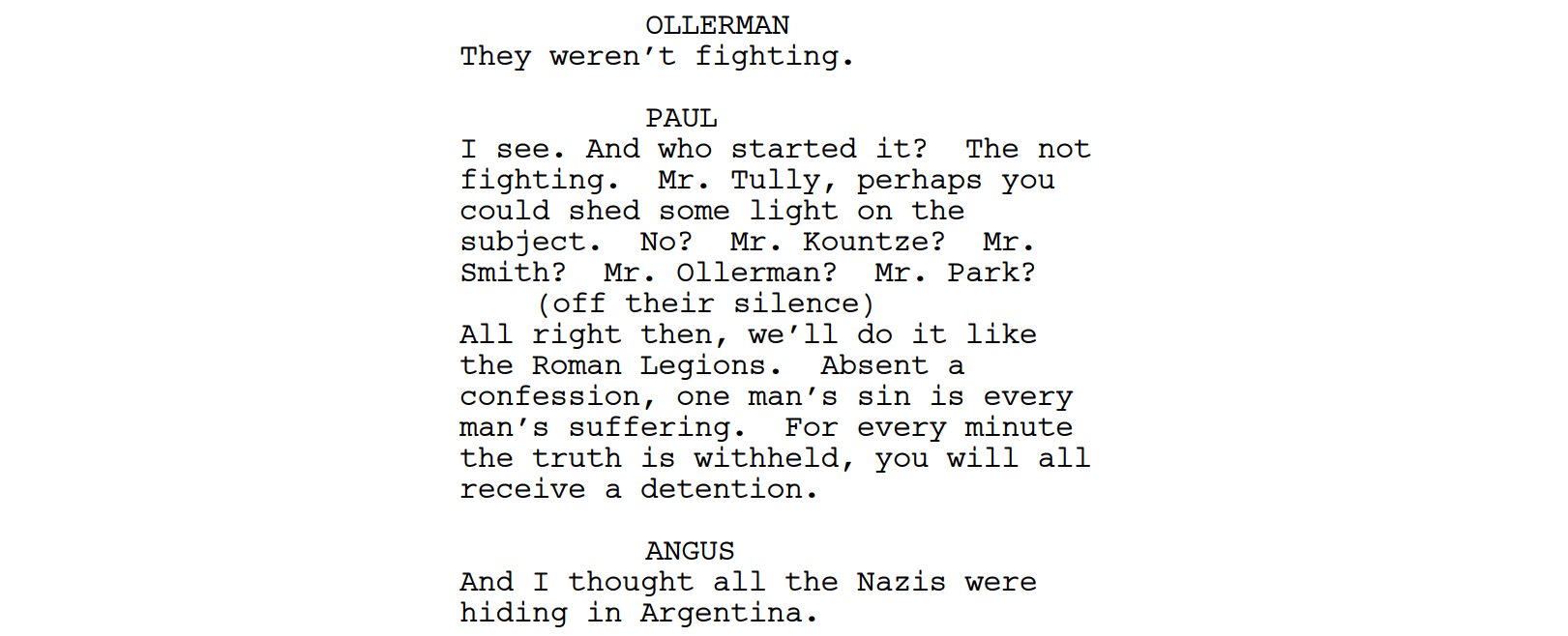 The students debate how to survive Paul’s reign, while he strategizes how to make them miserable. Mary’s arc begins when she notices Angus’ pain and Paul’s emotional failings, hinting at her role as the bridge between them.