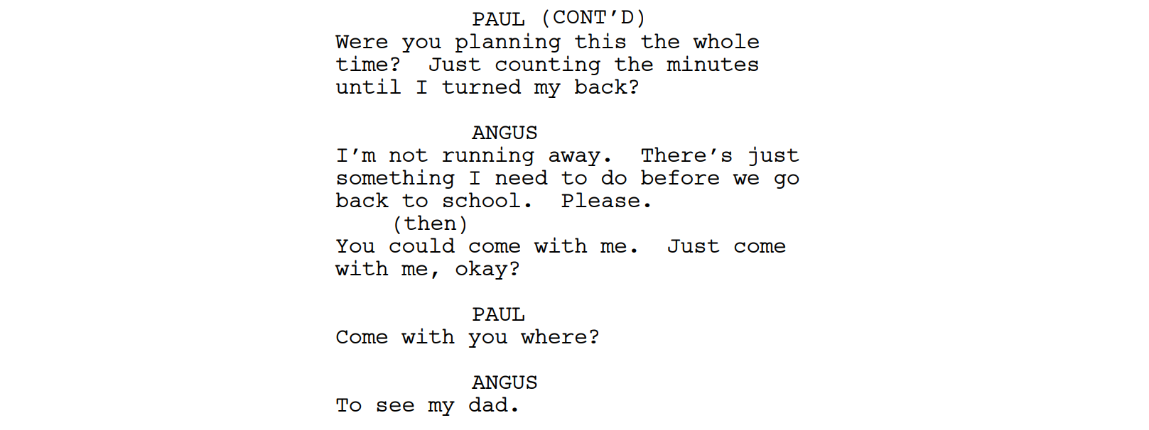 Paul catches him getting into a cab. He’s initially angered, believing Angus has misled him into thinking their relationship was progressing – but is sobered upon discovering that Angus is trying to visit his ailing father, who is still alive, contrary to prior understanding.